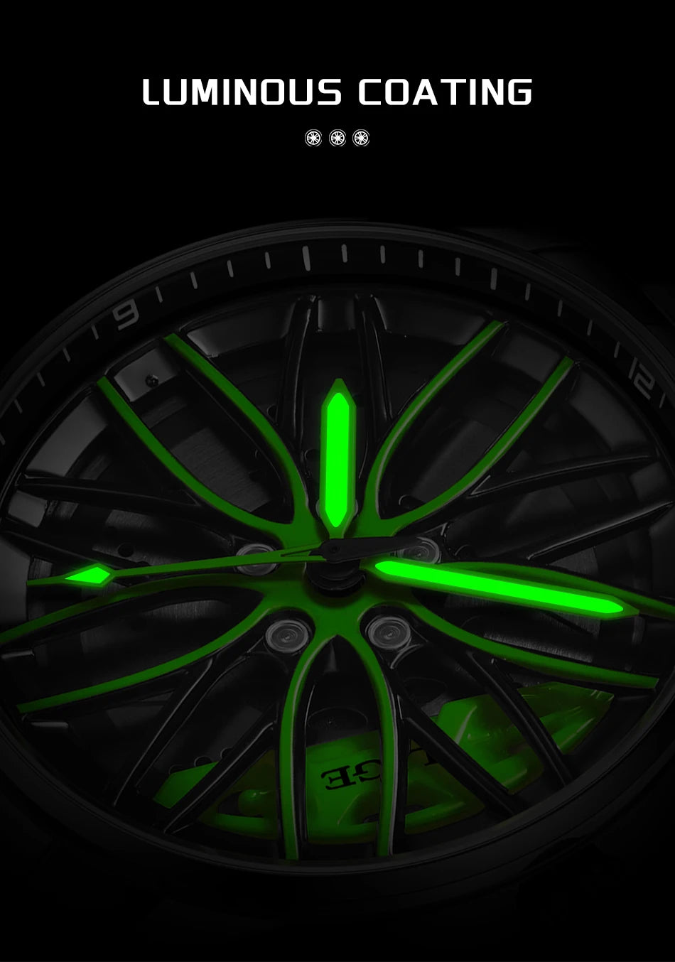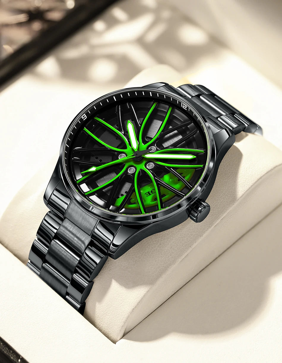 Siente el pulso de la ingeniería italiana en tu muñeca. Este reloj no es para los discretos; es una pieza audaz inspirada en los rines de araña (spider) de los icónicos Lamborghini Huracán y Aventador. Su carátula es una obra de arte agresiva, con un intrincado diseño de radios múltiples y una llamativa pinza de freno en un electrizante verde neón.