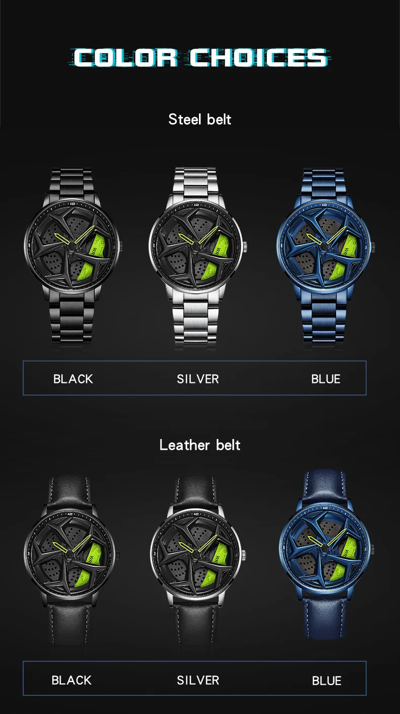Cada reloj de nuestra colección de relojes con forma de llanta de coche está meticulosamente diseñado para rendir homenaje al arte de la ingeniería automotriz. Desde esferas mecanizadas con precisión hasta una estética atrevida inspirada en las ruedas, cada reloj refleja el espíritu de los vehículos de alto rendimiento, creados para aquellos que aprecian el diseño, la velocidad y los detalles.